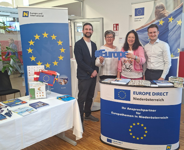 Europe Direct Niedeörsterreich informierte gemeinsam mit der Bildungsdirektion NÖ (Erasmus+ Kontaktstelle), der NÖ Regional GmbH (EU-Service-Agentur) und dem Verbindungsbüro des Europäischen Parlaments in Österreich (Erlebnis Europa Ausstellung) an einem gemeinsamen Stand über Bildungs-Angebote für Lehrkräfte und Beteiligungsformate für Schülerinnen und Schüler.